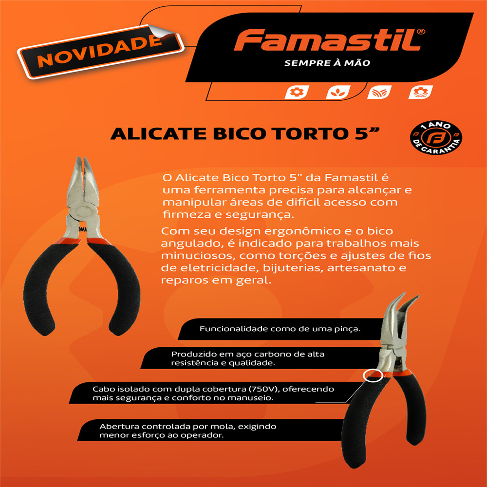 Alicate Bico Torto Famastil 5" | precisão em manuseio, resistência, ideal para eletrônica