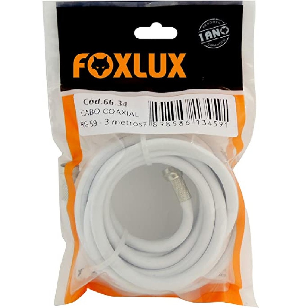 Cabo Coaxial RG59 67% 3 Metros Foxlux Branco para TV Antena e CFTV Transmissão Estável de Sinal