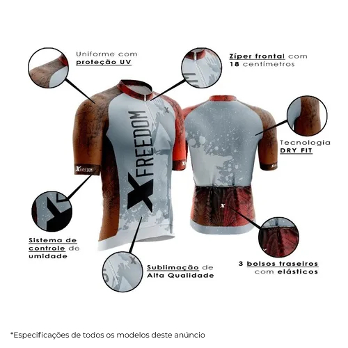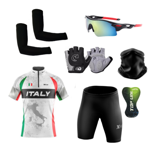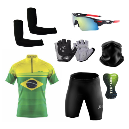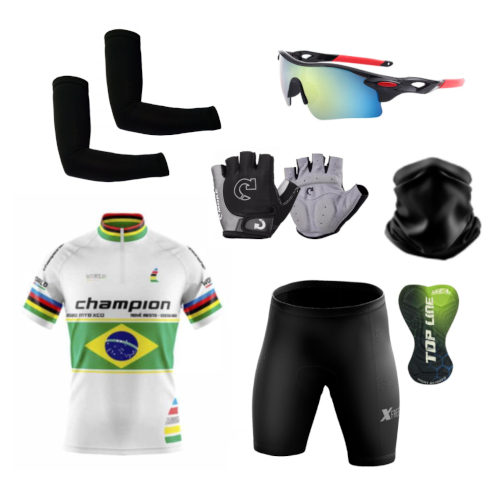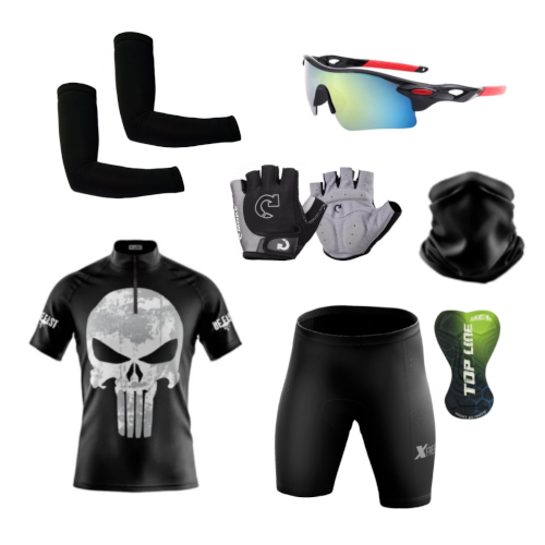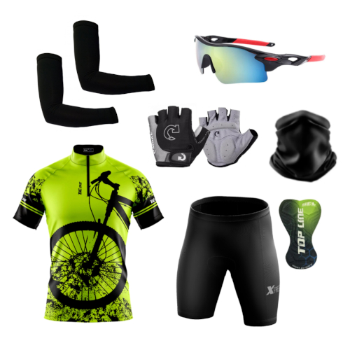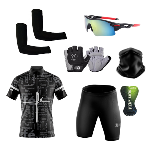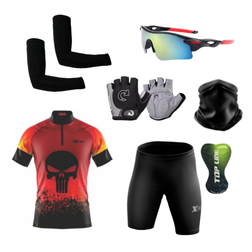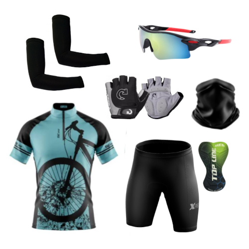 Conjunto Uniforme Ciclismo + Par de Luvas + Óculos de Proteção + Par de Manguitos + Bandana