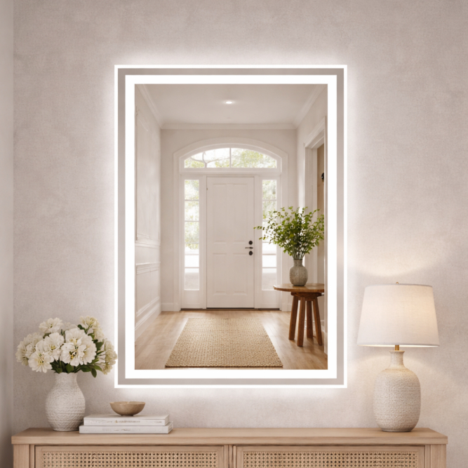 Espelho Grande Retangular Com Led Jateado e touch 80X50 Ideal Para Banheiro Lavabo e Penteadeira de Maquiagem