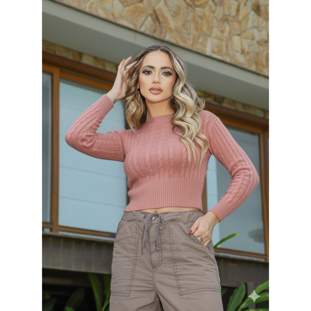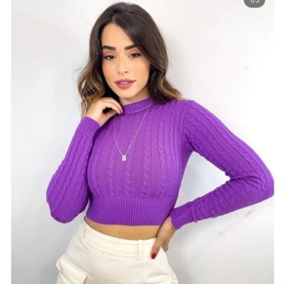 Blusa Cropped Feminino Manga Longa Tricot Modal Elegante