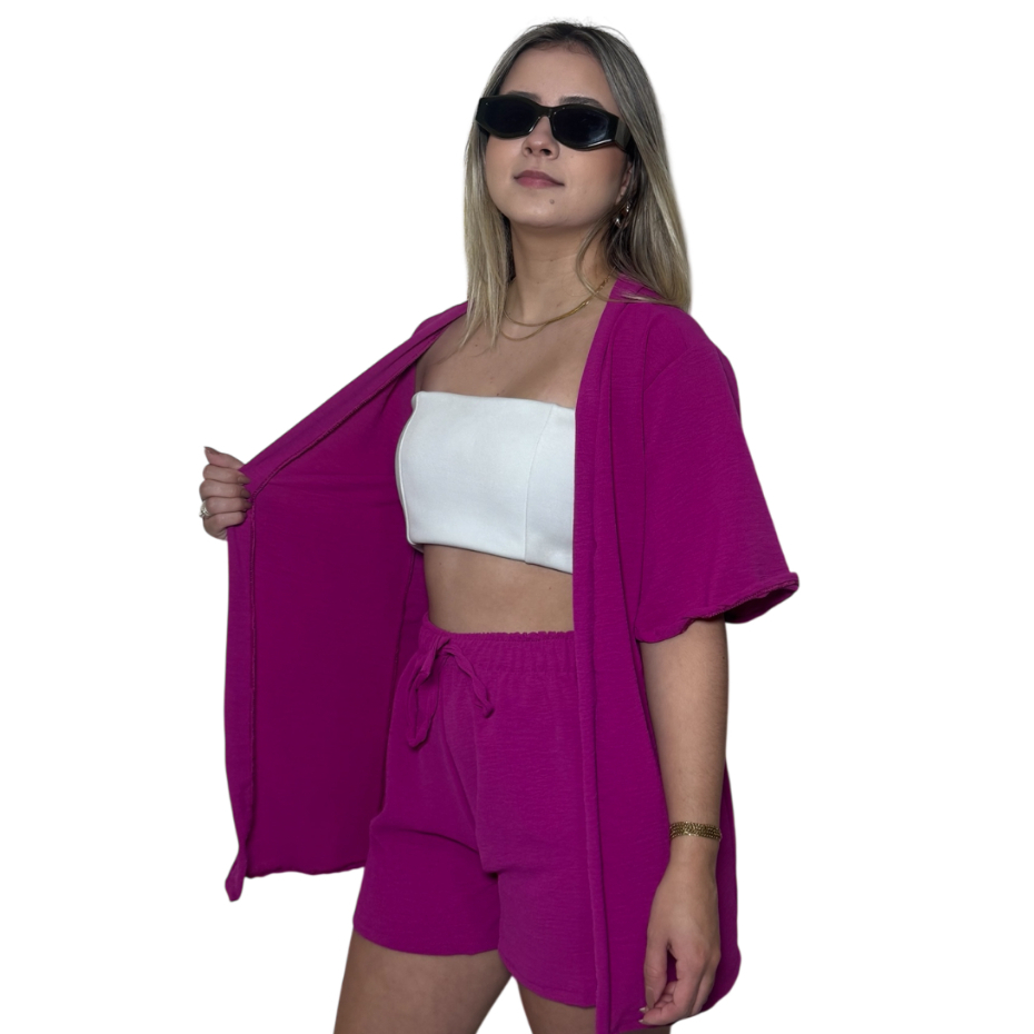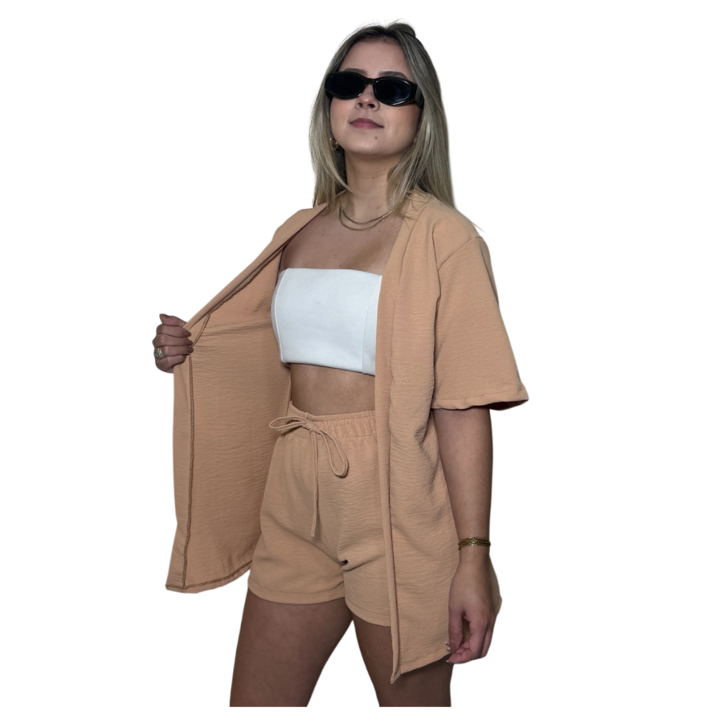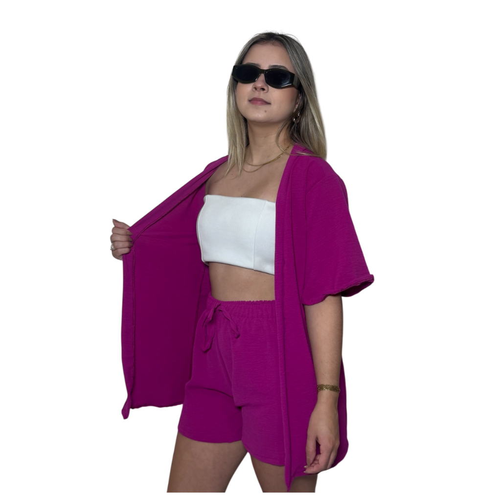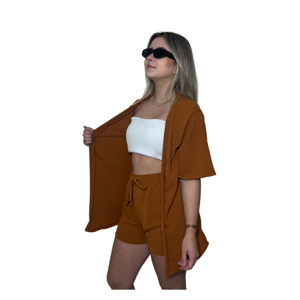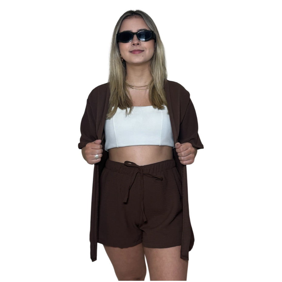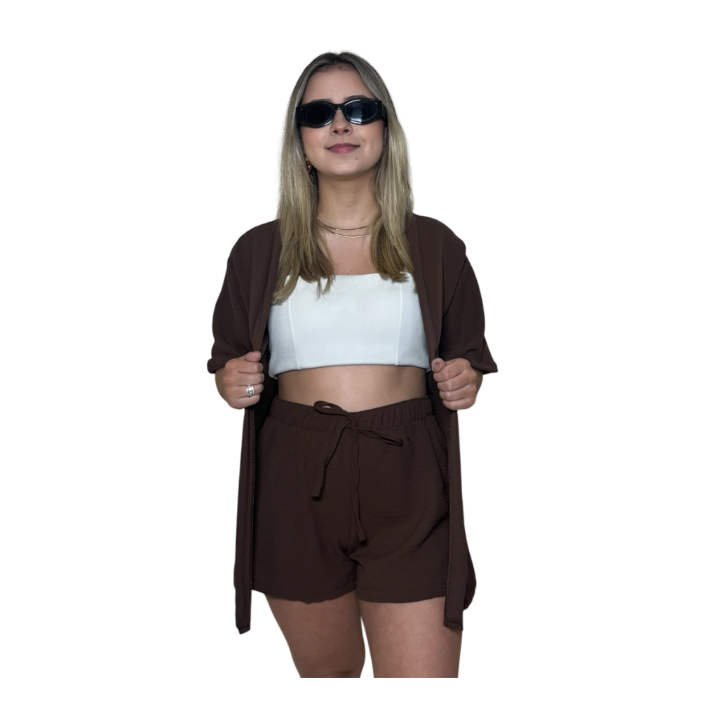 Conjunto Kimono Short Duas Peças Moda Praia Azul Lilas Roxo Verde Saida de Praia Quimono Marrom