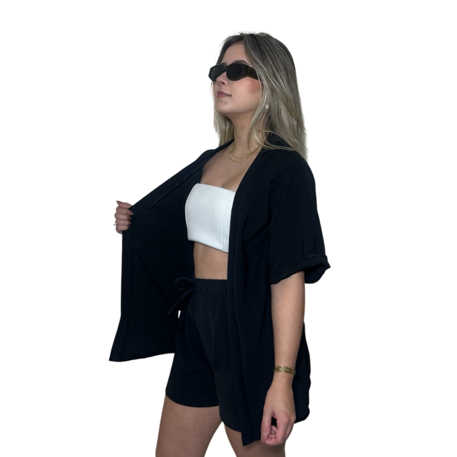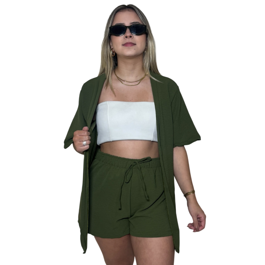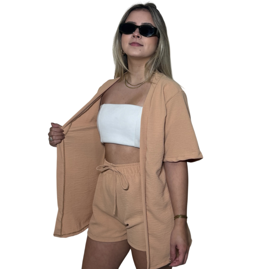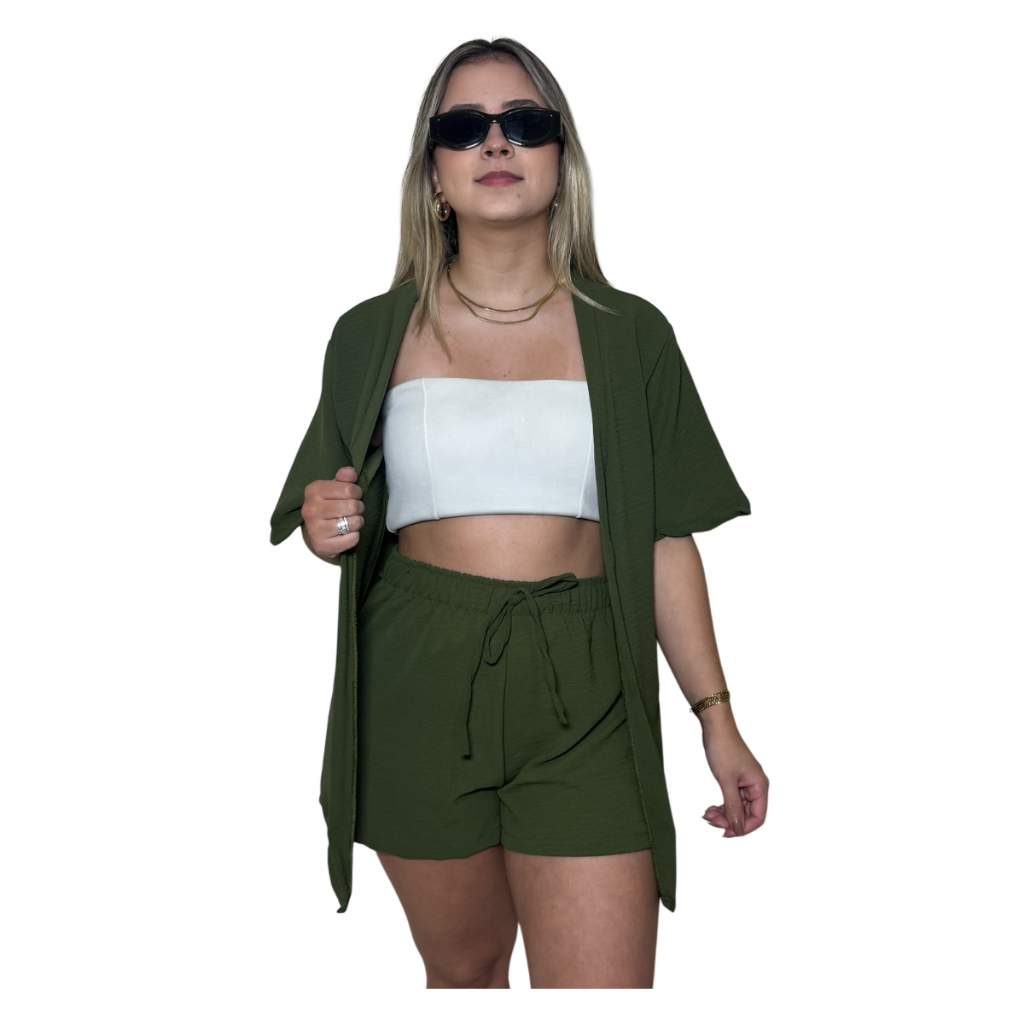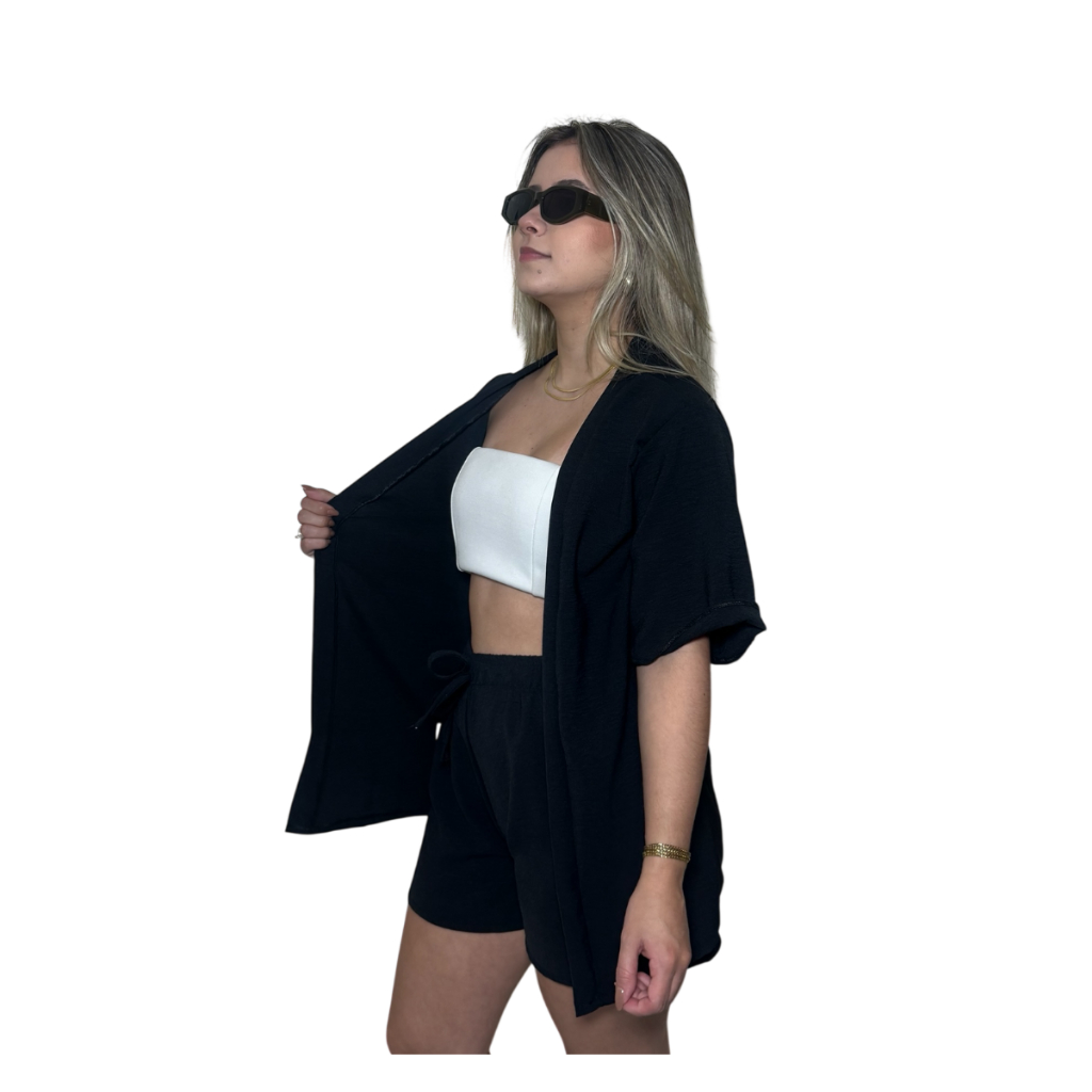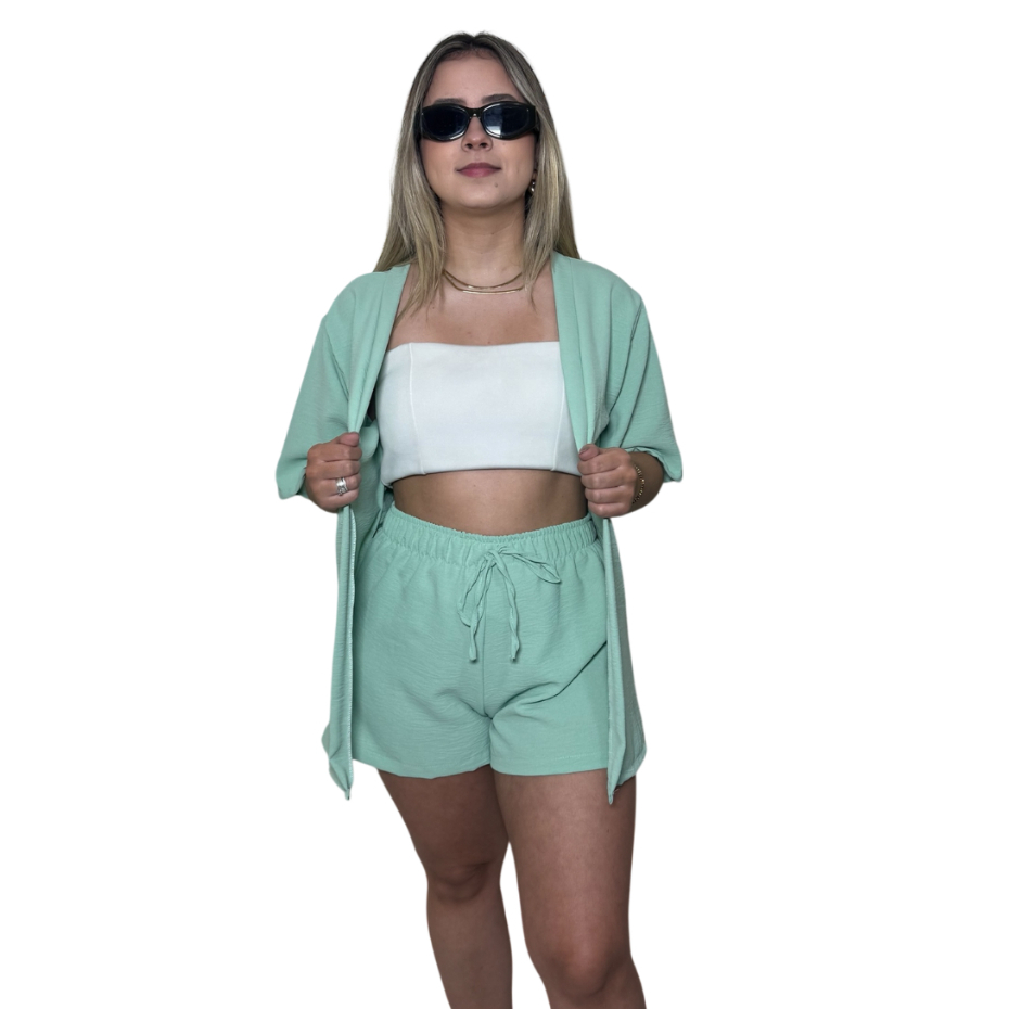 Conjunto Kimono Short Duas Peças Moda Praia Azul Lilas Roxo Verde Saida de Praia Quimono Marrom