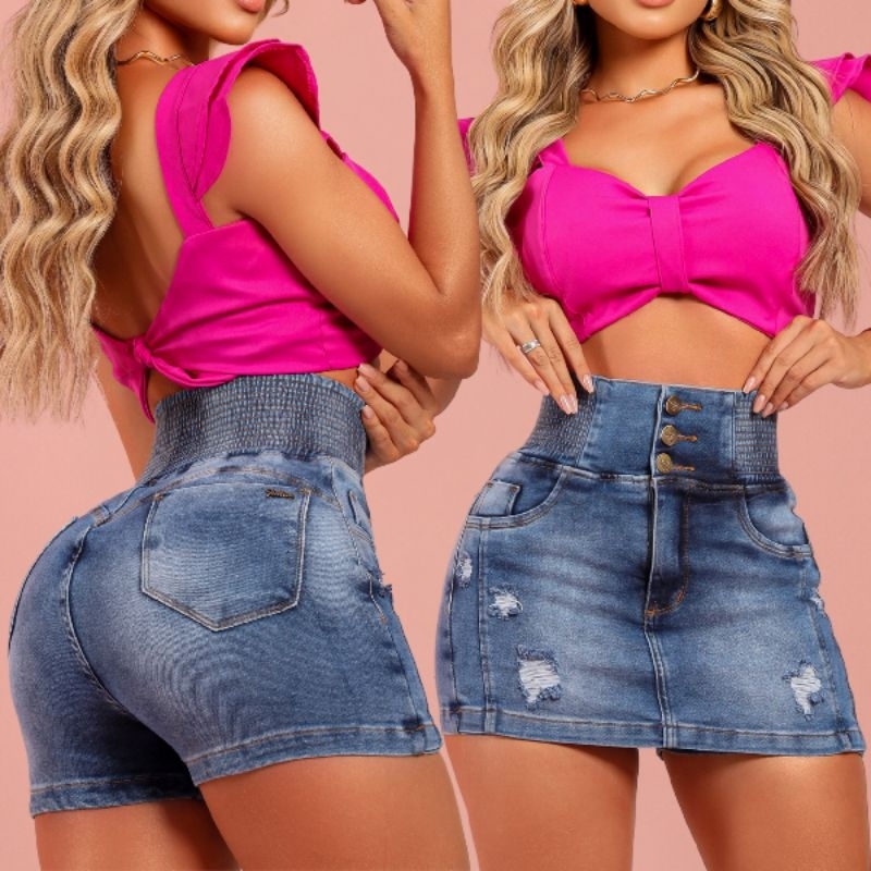 Short Saia Jeans Feminino Modelador Cintura Alta Com LAYCRA Premium