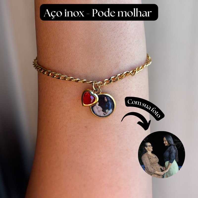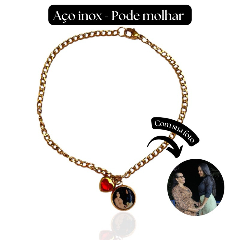 Pulseira com pingente personalizado com sua foto, aço inox a prova d’água. Não perde a cor, antialérgico.