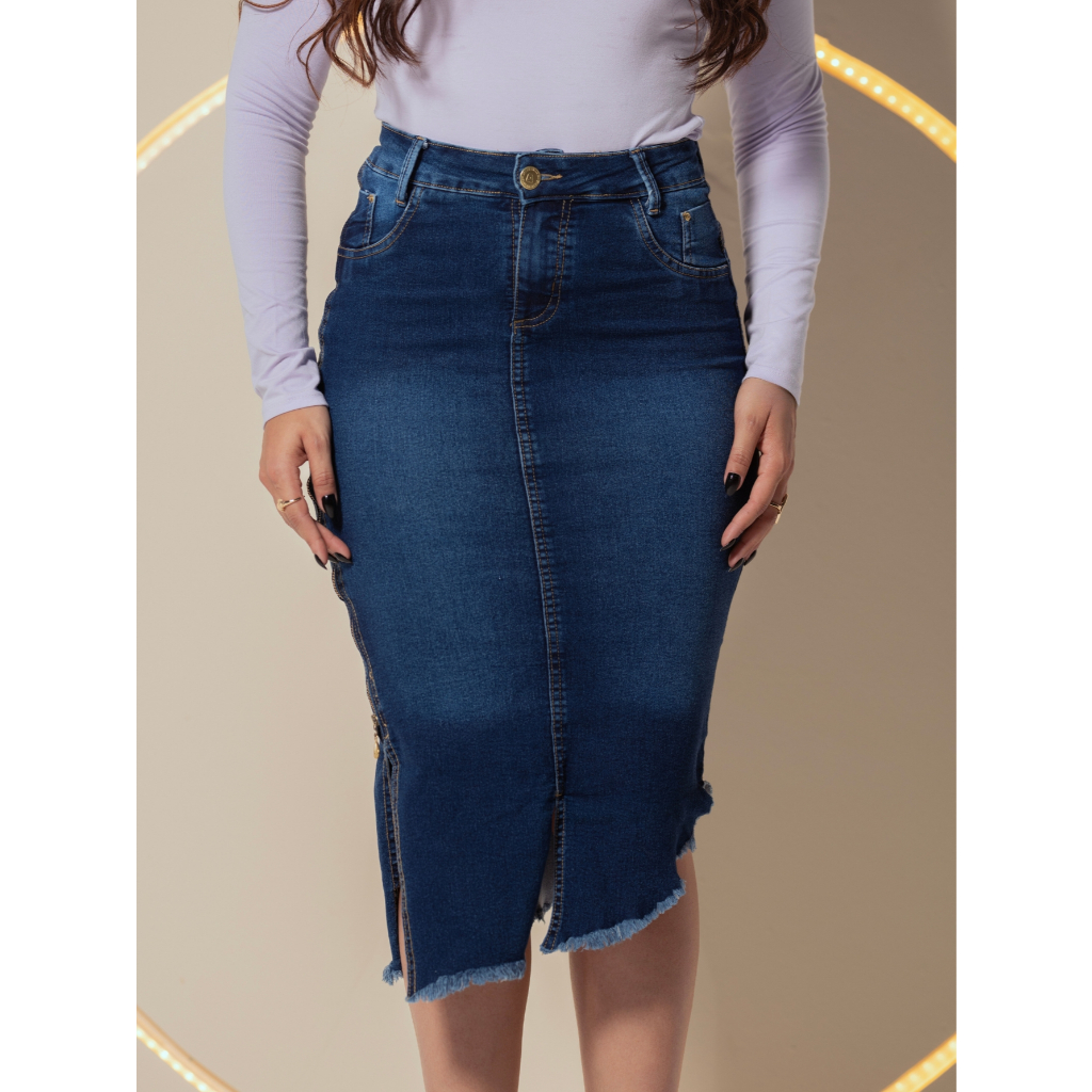 Saia Jeans Moda Evangelica Midi Ziper Lateral Ref.177