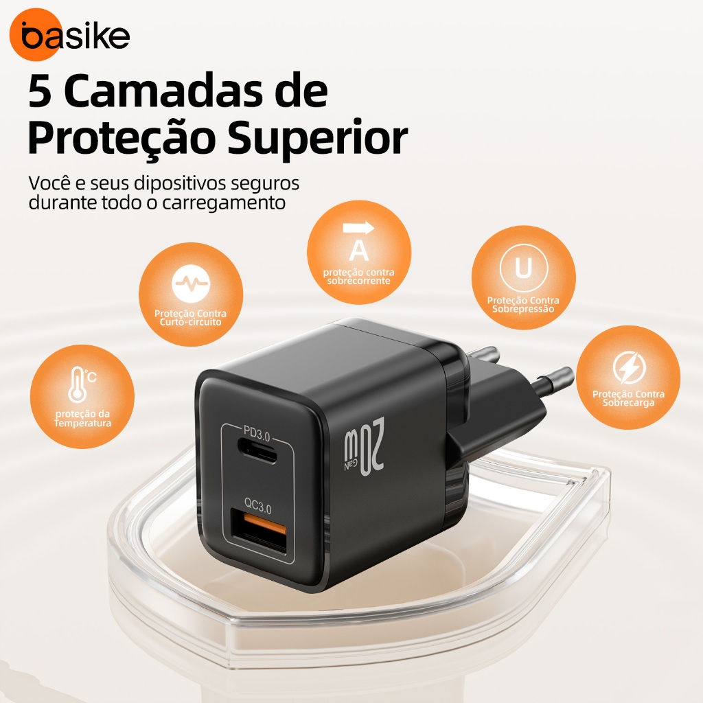 Astgn X Basike Carregador Basike Ba-CAR046 20W Turbo – USB-C PD + USB QC 3.0, Bivolt, Compacto