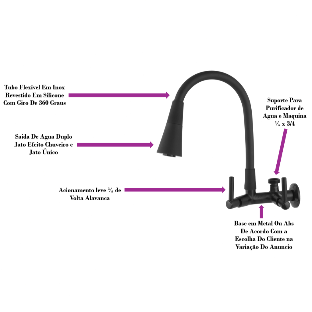 Torneira Flexivel Para Cozinha Com Saida Purificador e Maquina 1/4 x 3/4, Torneira Cozinha Parede