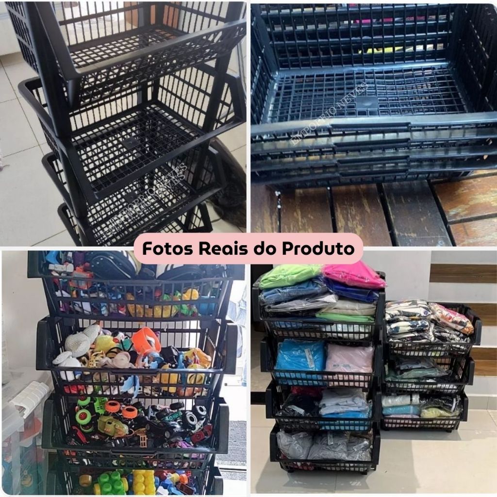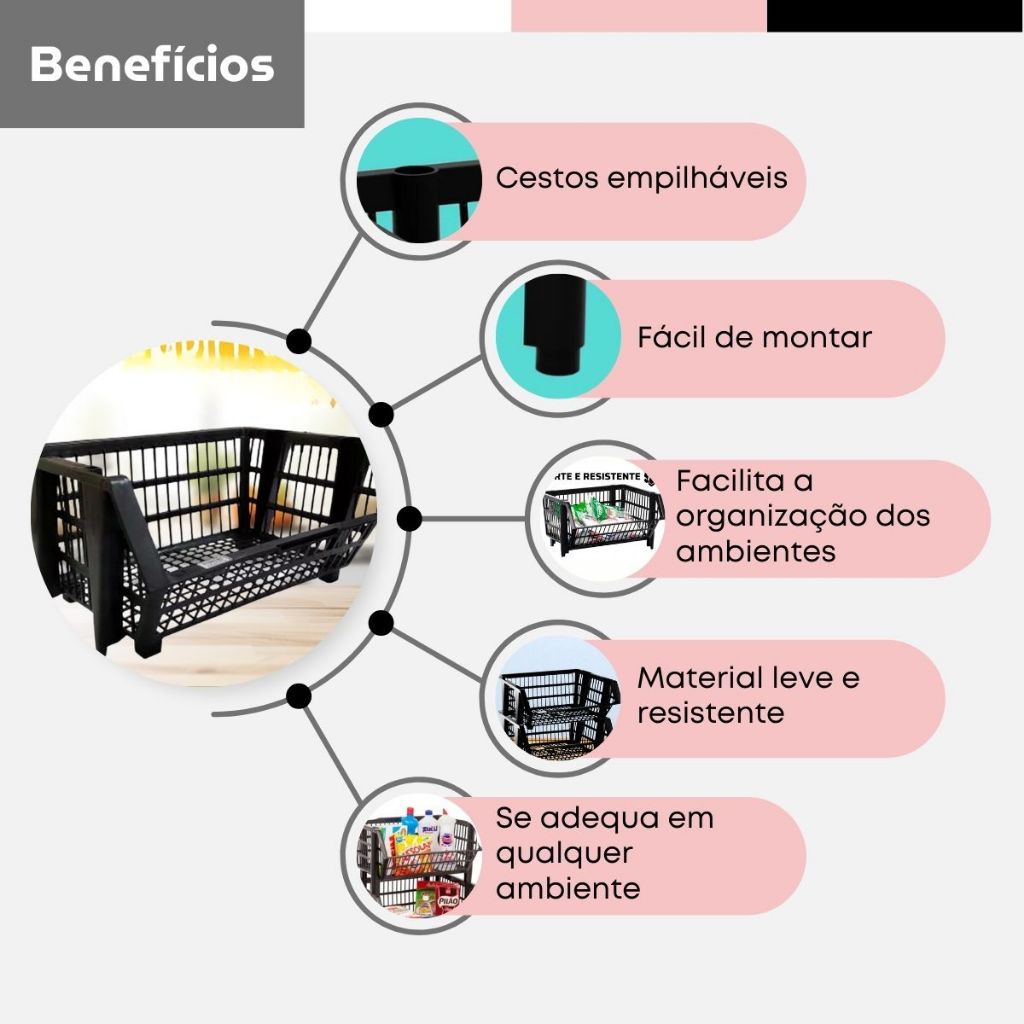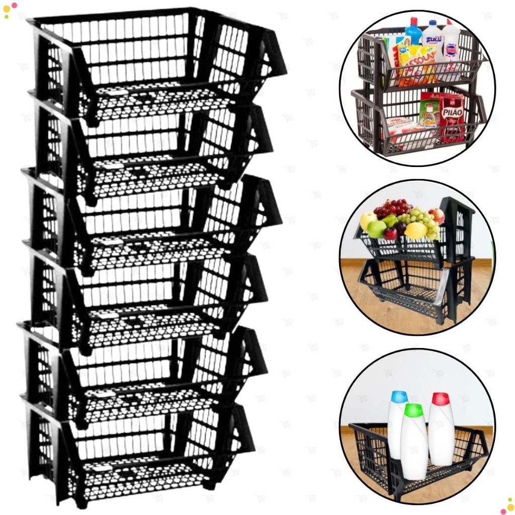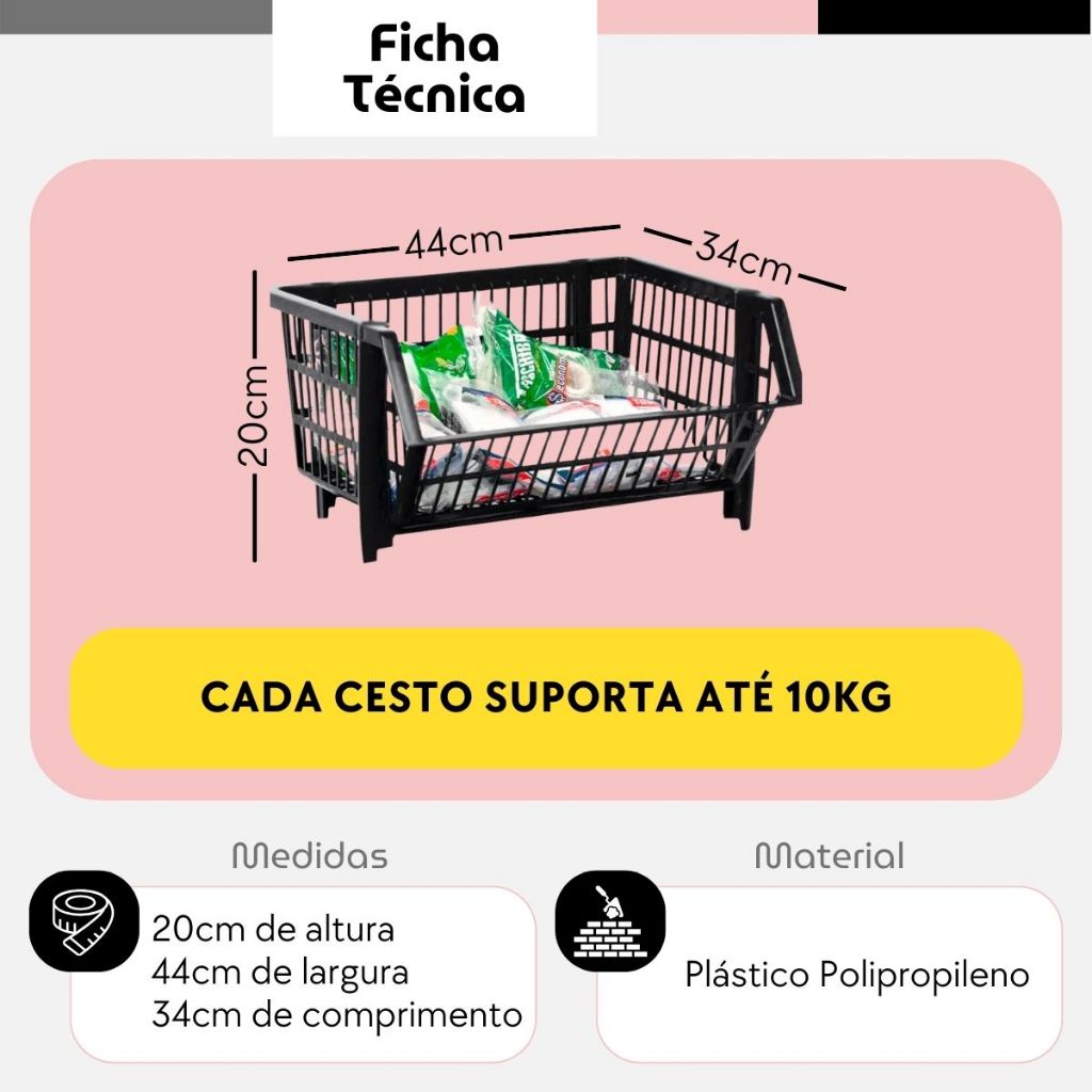 Kit 10 Cestos Organizador Empilhavel Cestao Expositor Loja Estoque Dispensa Plástico Preto 20x44cm