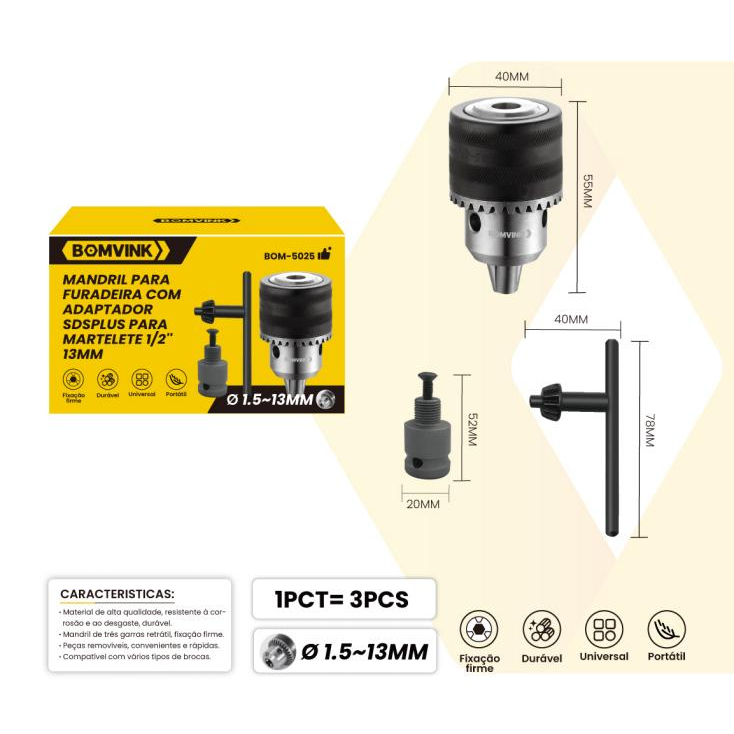 Kit 3 PCS Adaptadores Mandril e Furadeira de Impacto Adaptador SDS Plus Martelete