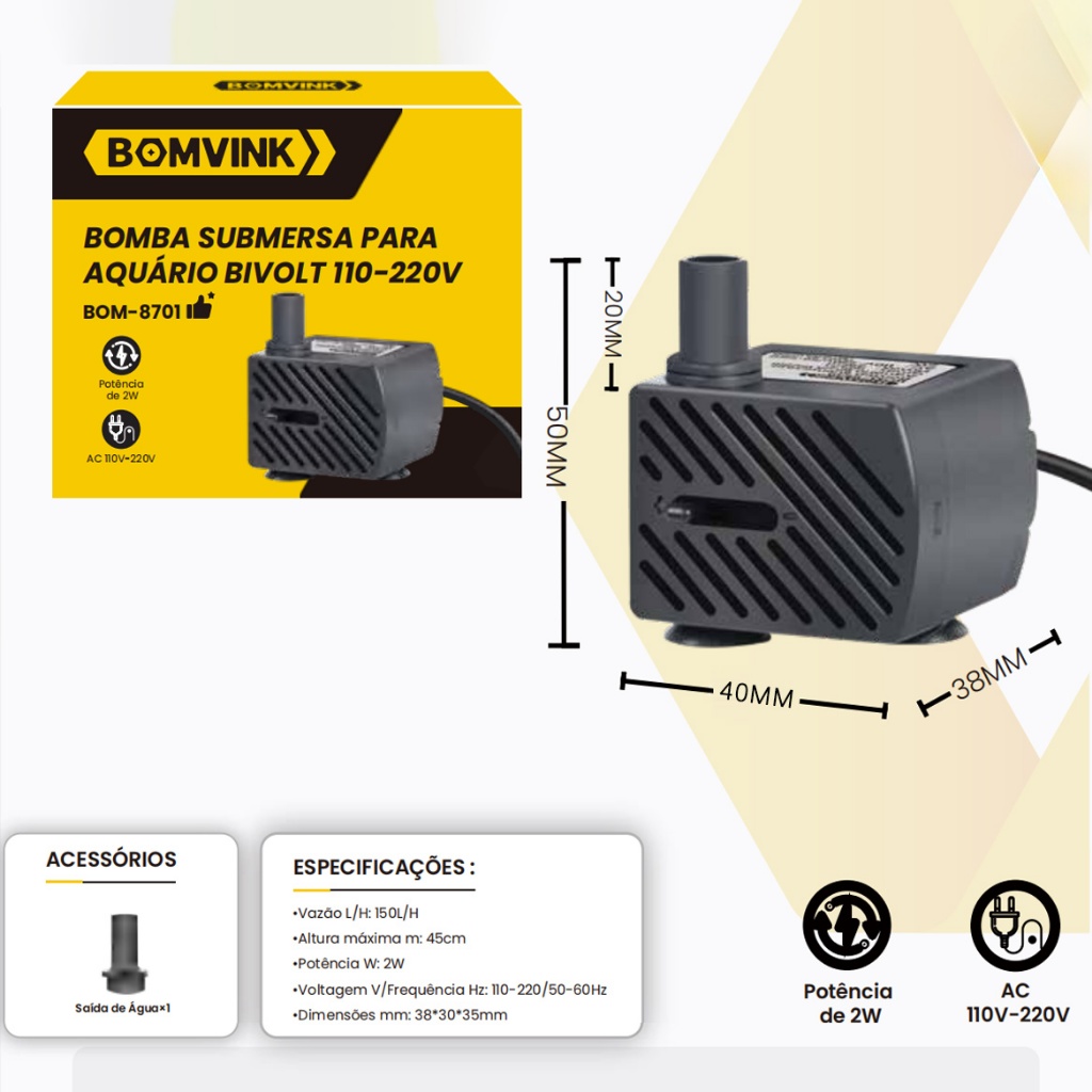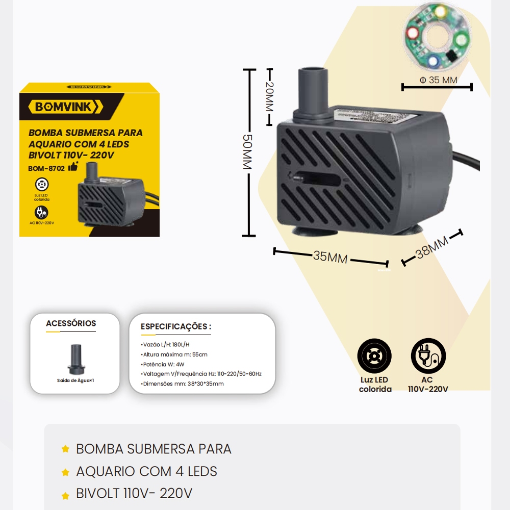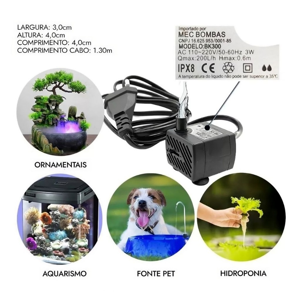 Bomba Submersa Com luz Bombinha Motor Aquário 180L/H Água Gato Cachorro Peixes Pet