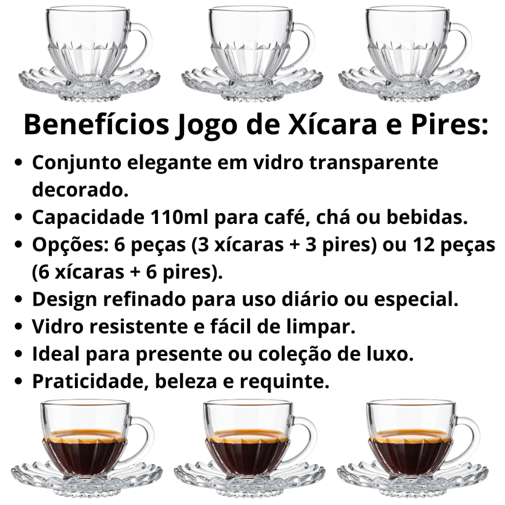 Jogo de Xícara com Pires 6 ou 12 Peças Cha e Café Brasiliano Transparente Vidro 110ml Decorada Luxo