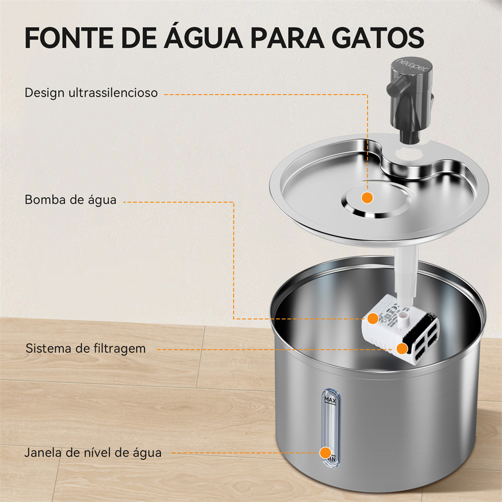 Newpet Bebedouro De Aço Inoxidável 3L Para Cães Automático Animais Domésticos Gatos Fonte 5V USB Alimentado - BIVOLT