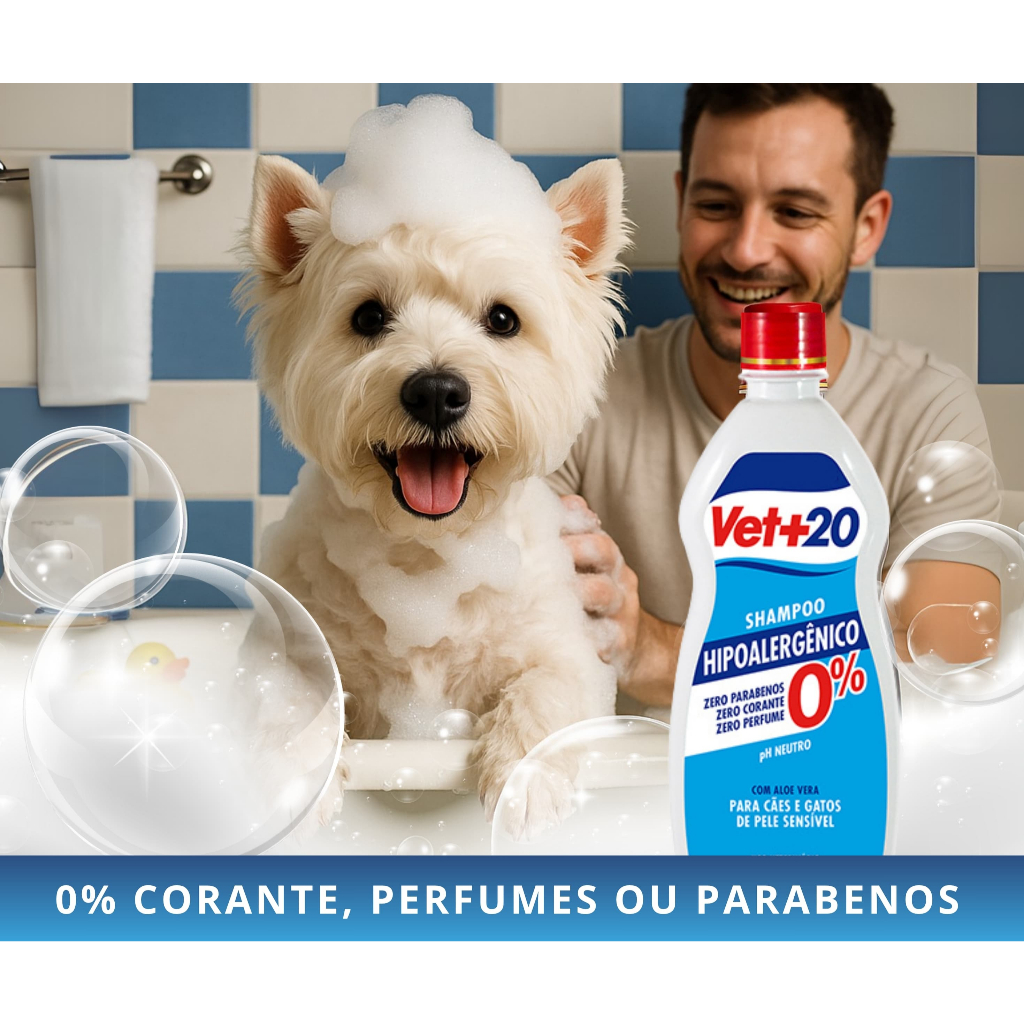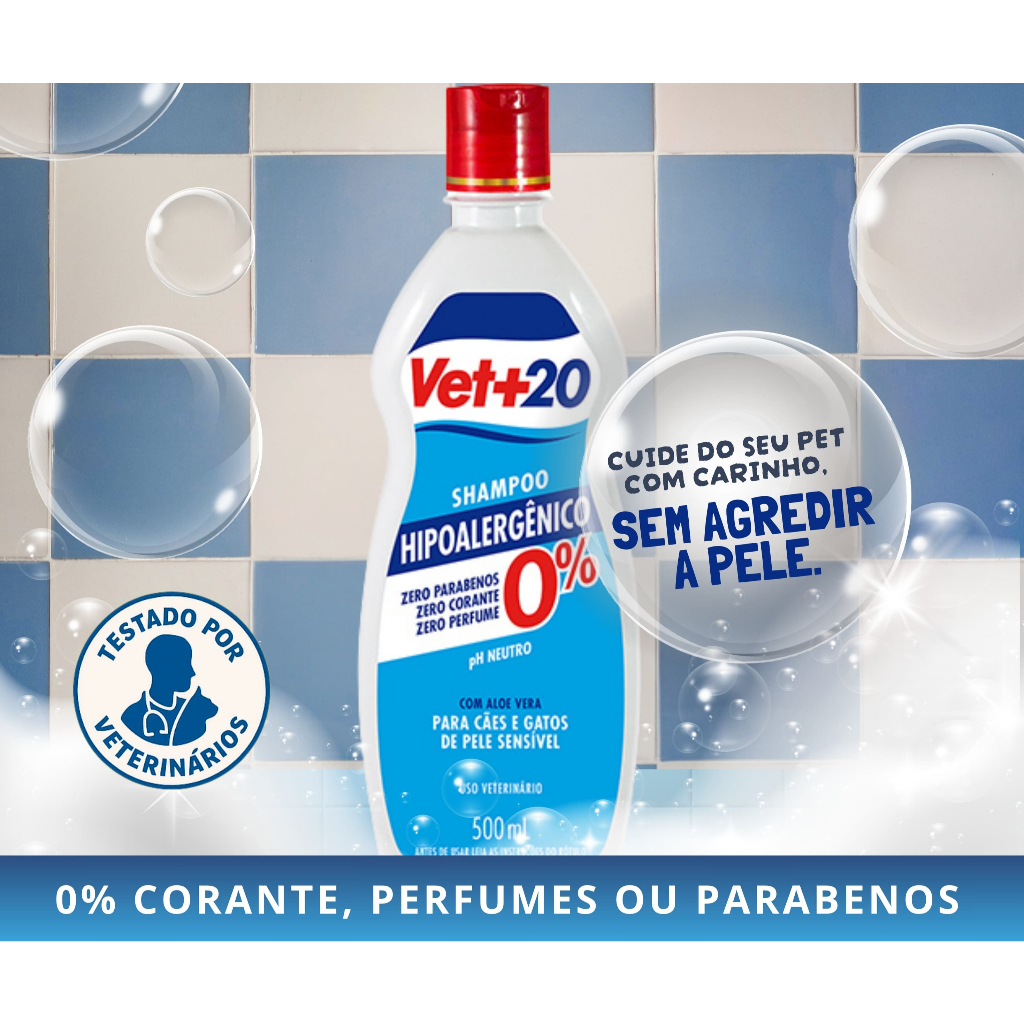 Shampoo Hipoalergenico VET+20 500 mL - Indicado para Cães & Gatos com Hipersensibilidade na pele | 0% Parabenos | 0%