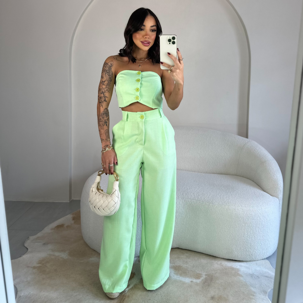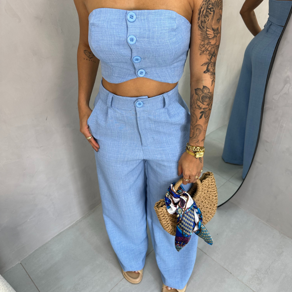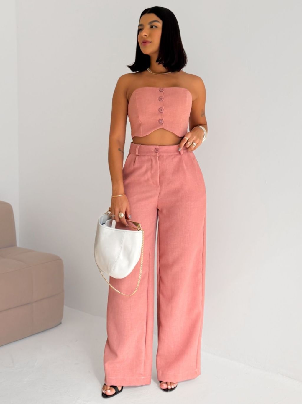 Conjunto Feminino Top e Calça em Linhão Candy Colors Top Tomara Que Caia Com Botões