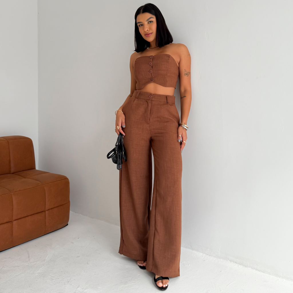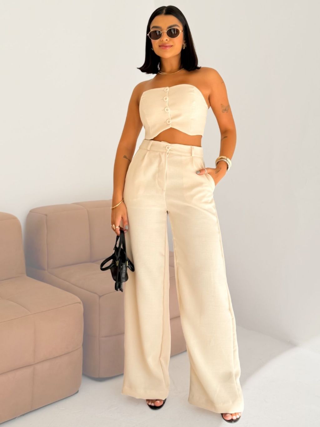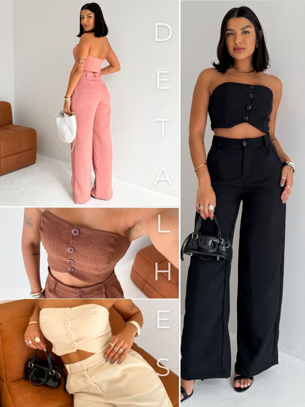 Conjunto Feminino Top e Calça em Linhão Candy Colors Top Tomara Que Caia Com Botões