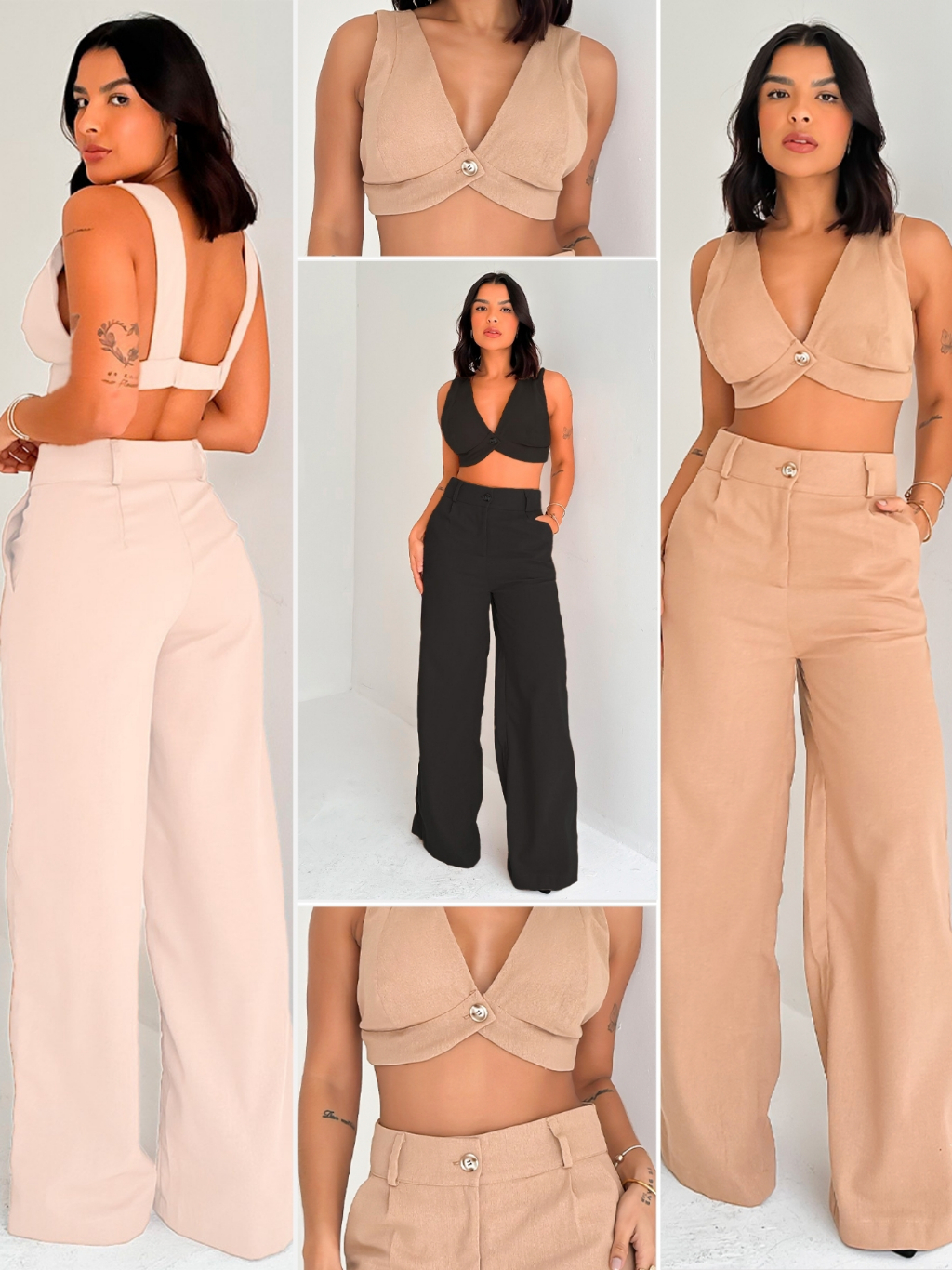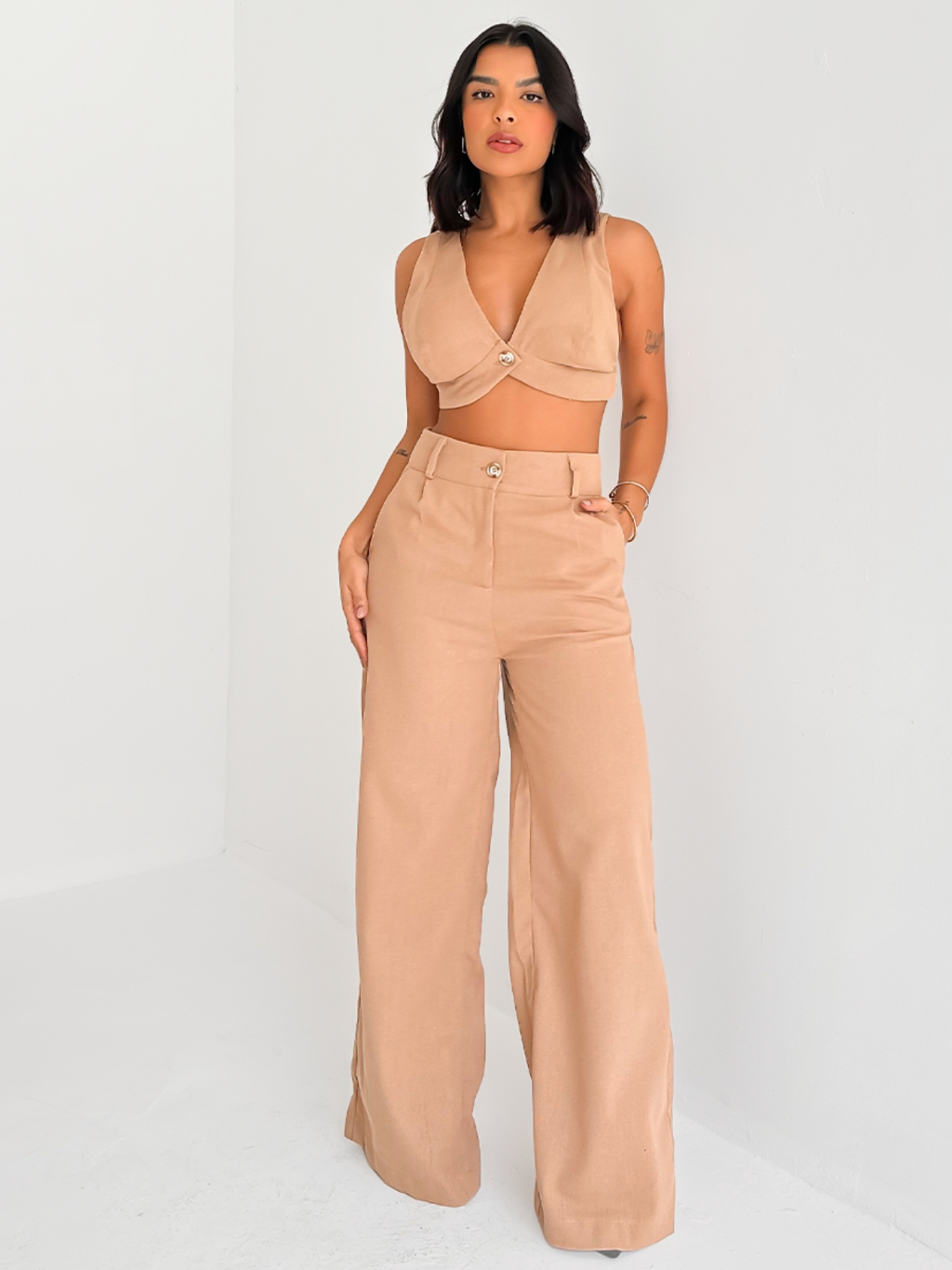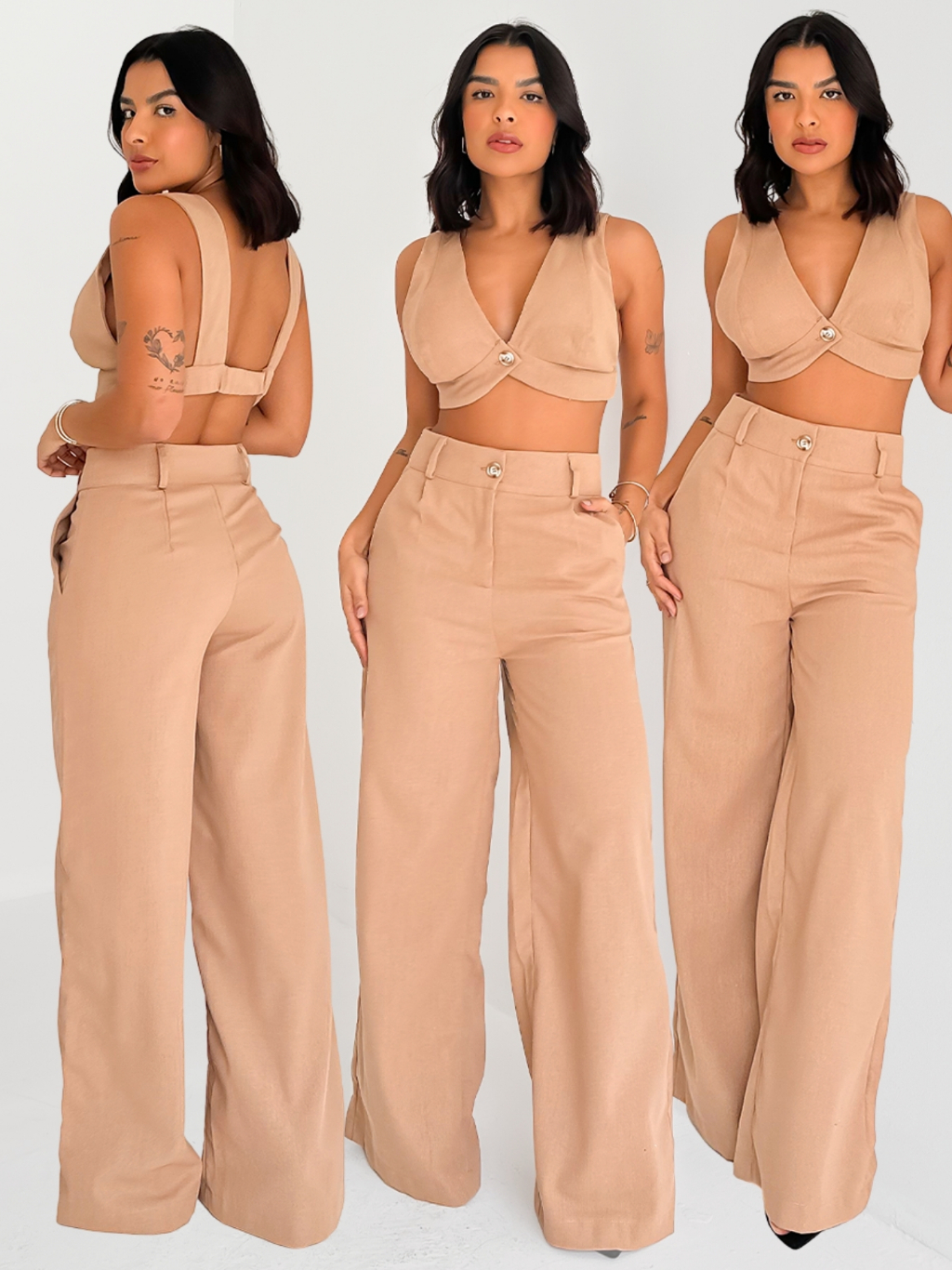Conjunto Feminino Linho Top Alças e Calça Pantalona Verão Fluida Leve Fresca para o Dia a Dia
