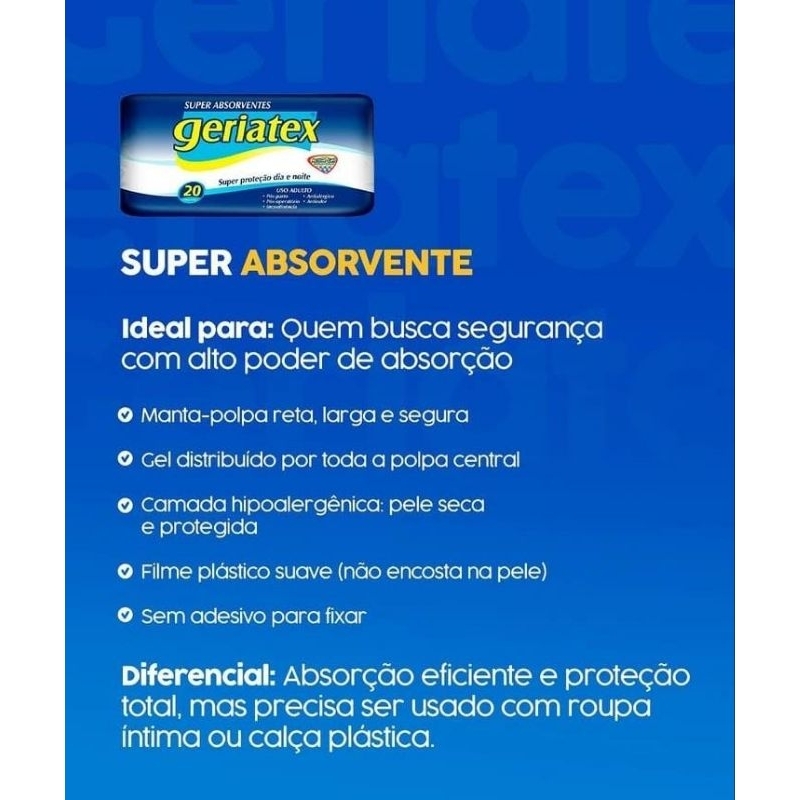 Promoção 4 Absorvente Geriatrico Pós Parto/Pós Operatório/Incontinencia/Antiodor Geriatex C/20 Unidades 4uni