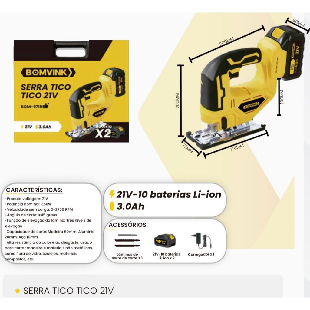Serra Tico-tico a Bateria Com 2 Baterias 21v ou 12v Sem Fio Cortar Madeira Potente - Bivolt