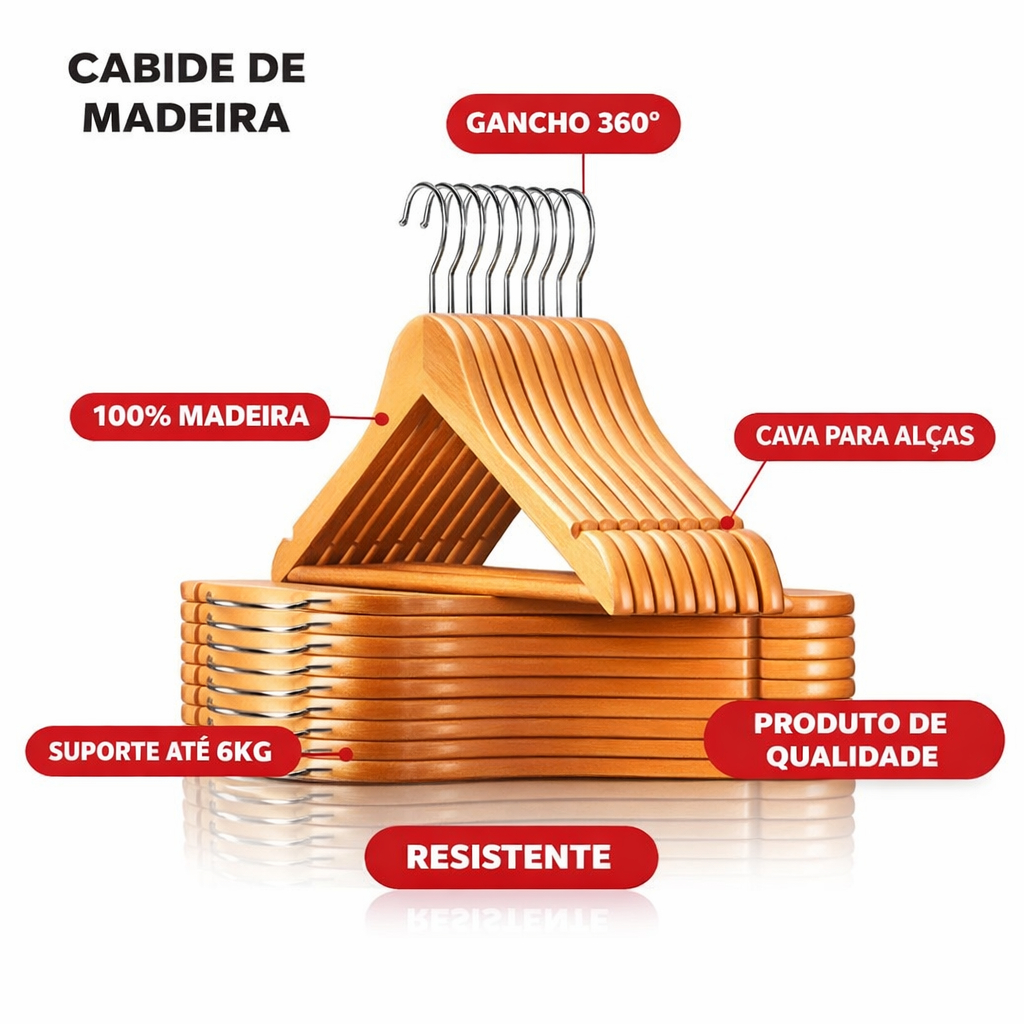 Kit 30 a 120 Cabides Madeira Premium Marfim Roupas Calca Gancho Cromado Antideslizante Duravel