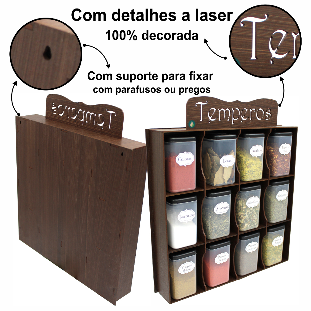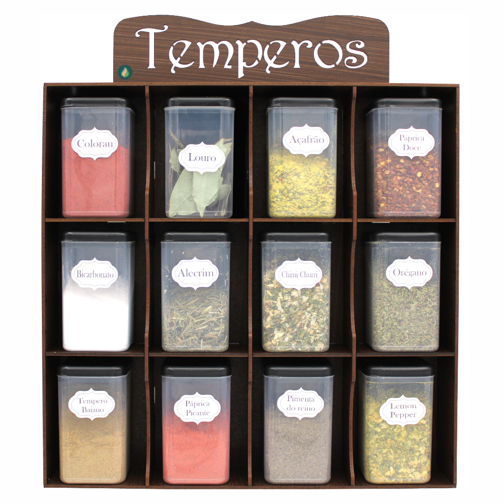Porta tempero prateleira organizadora em MDF decorado - 12 Potes - Condimentos Mantimentos Original