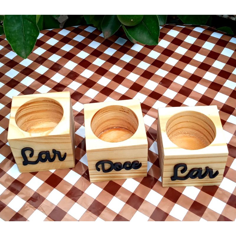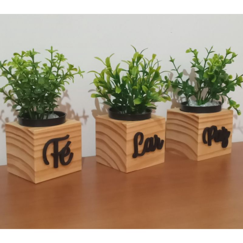 trio de vasinhos de madeira com plantinha artificial/decoração
